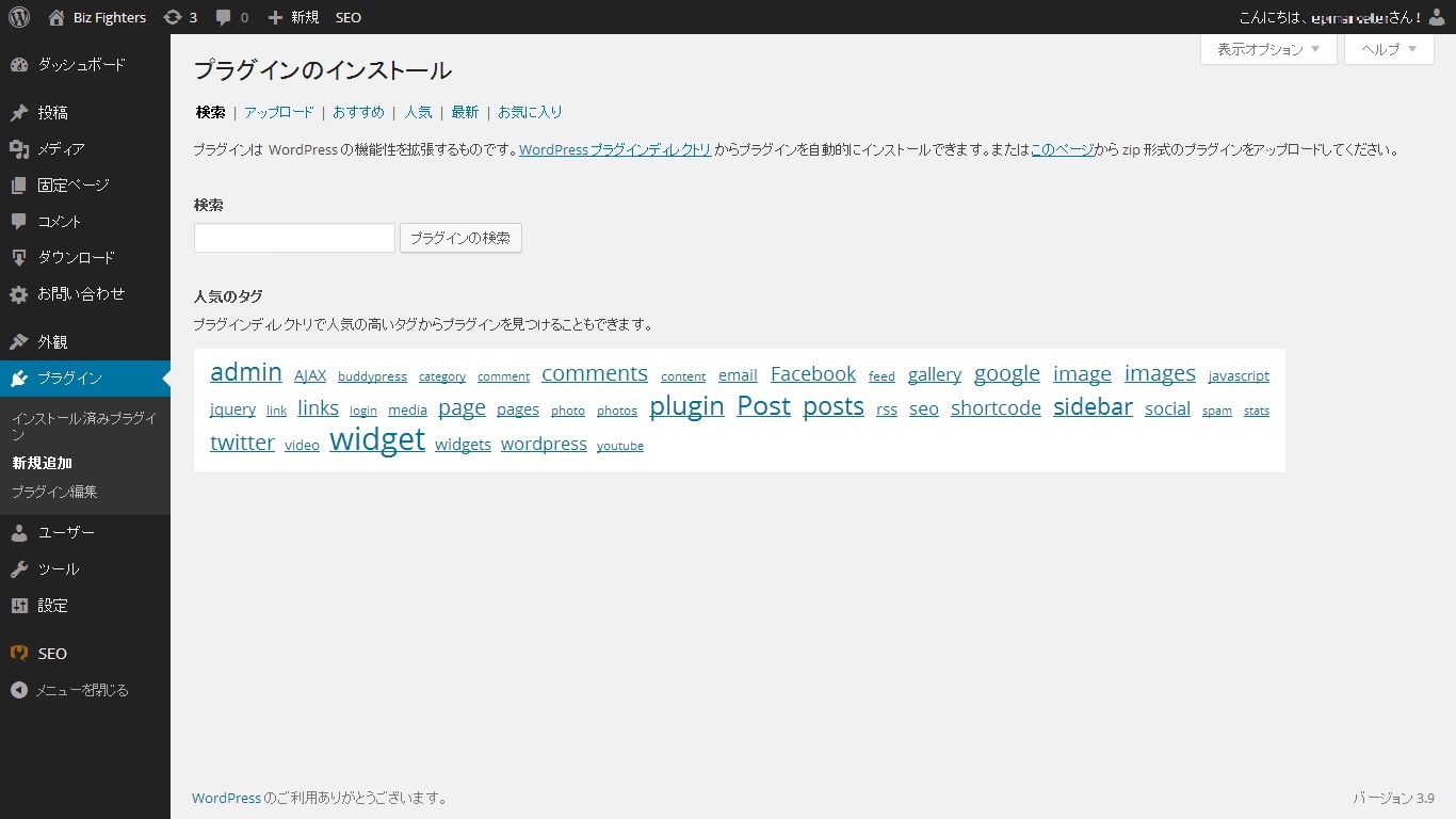 ピクセルコードをトラッキングしたいページのHEADタグの間に埋め込まなければなりませんが、まずはWordpressのプラグインをインストールします。WordPressの管理画面にログインし、プラグインのインストール画面へ移ります。
